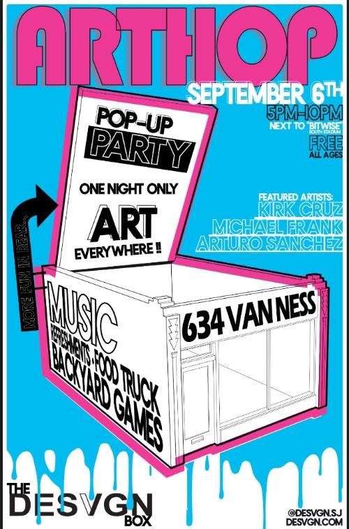 [perfectpullquote align=”full” bordertop=”false” cite=”” link=”” color=”” class=”” size=””]Our party is open to the public and to all ages. Expect music, beverages, food trucks, backyard games, and artwork everywhere. In case you have not checked our website www.desvgn.com lately, our featured artists for the event will be: Kirk Cruz (pen and ink artist), Michael Frank (digital artist and board member at Sorensen Studio), and Art Sanchez (showcasing his mural artwork).[/perfectpullquote]