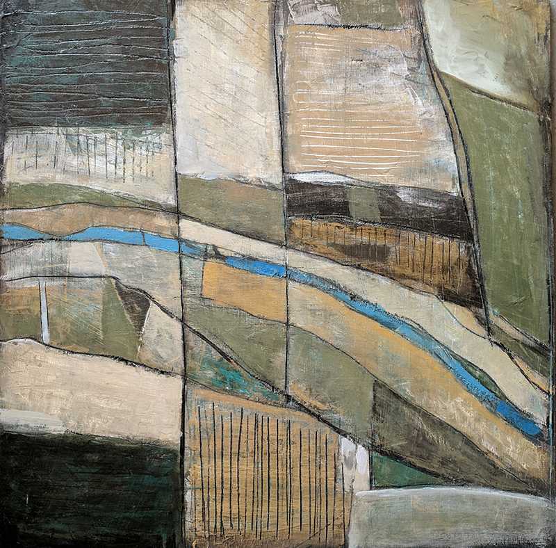 [perfectpullquote align=”full” bordertop=”false” cite=”” link=”” color=”” class=”” size=””]Much of the inspiration for this work comes from areas surrounding the San Joaquin and Kings Rivers. The rows and roads bisect the compositions as gridded fields take shape on the canvas.The shimmering river cuts a cool wavy line through the verdant, but sometimes arid, landscape.[/perfectpullquote]