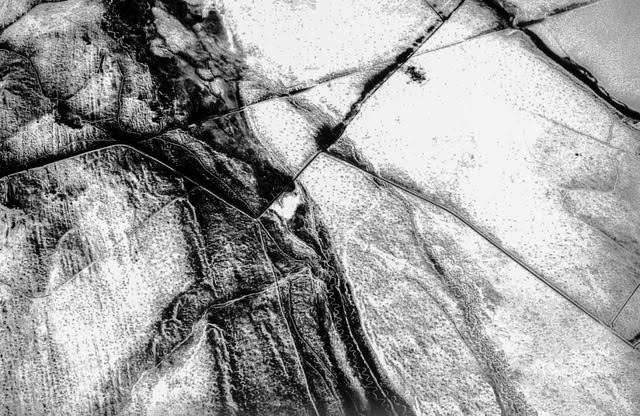 Do you ever get on a plane and find yourself nearly hypnotized by the landscape rolling by under you? Kathy Wosika has long had this infatuation. Her new exhibition, “Earth’s Canvas,” at Fig Tree Gallery, consists of photographs taken over a 20-plus year period of time from airplanes, flying between the East and West Coasts of the US at 30,000 feet.