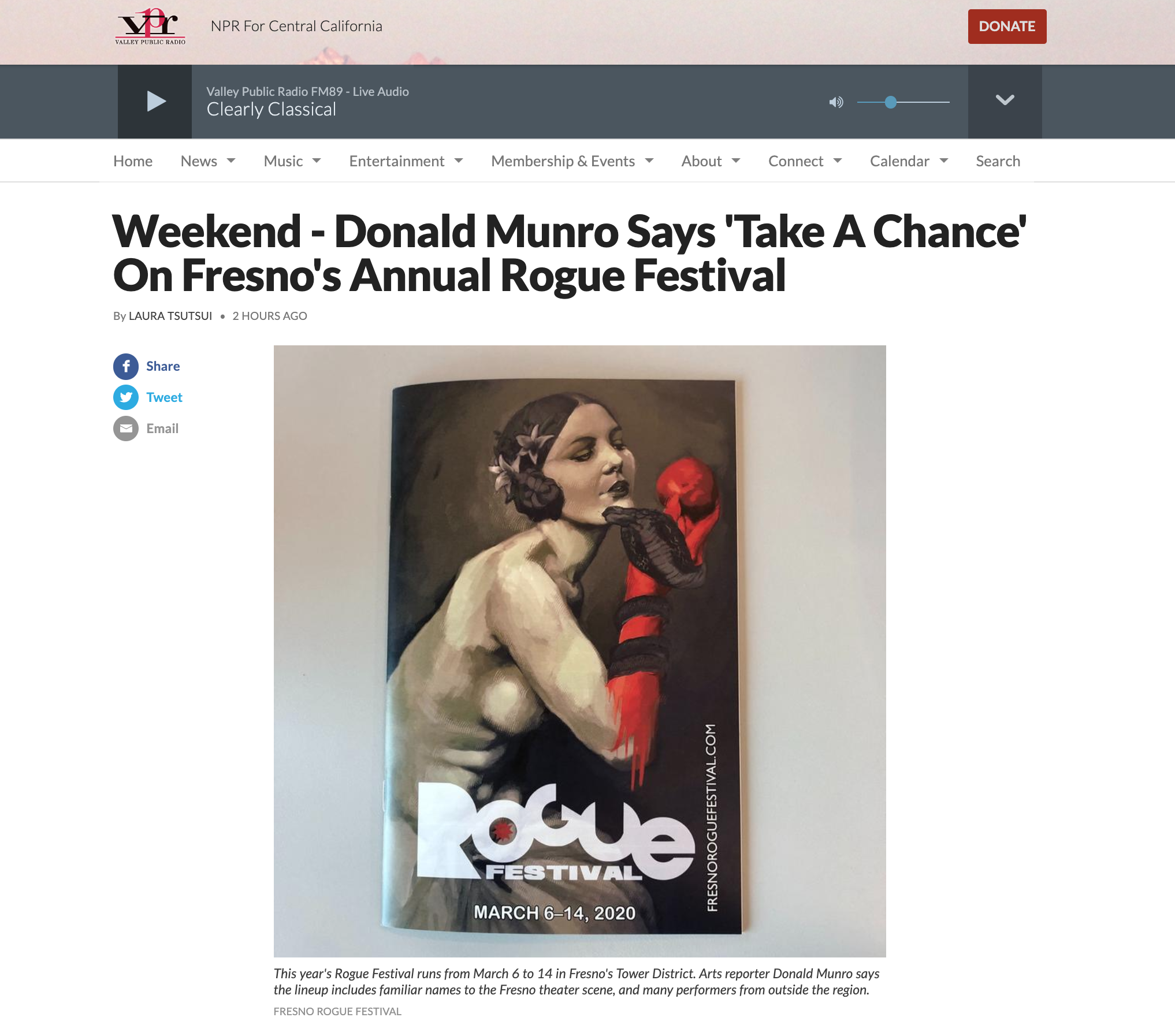 Listen to me from this morning’s Valley Public Radio broadcast when I talked with Laura Tsutsui about strategies for attending the Rogue. It’s a fun 11-minute piece, which you can listen to on the KVPR website. I toss some well-known names into the mix (including Victor DesRoches, Noel Adams, Karan Johnson, Britt Monahan, Janice Noga, “Flower Tome Companion” and more), plus give shout-outs to such titles as “Man Cave: A One-Man Sci-Fi Climate Change Tragicomedy.”