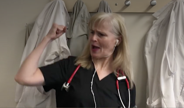Even with all that Broadway star wattage, I really do think Salisha stands out in terms of her buoyant screen presence and enthusiasm. (I know, I have that Fresno-bias-thing going on.) At one point she is featured in a nice vocal solo and several-second-long, full-screen shot. The video hits its stride when singing healthcare workers are integrated into the ensemble; it’s touching when the Broadway actors and doctors/nurses start sharing the screen together. My favorite singer (besides Thomas, obviously) is a medical worker wearing a black top and piercing red stethoscope, whose energetic performance makes you want to dance along: