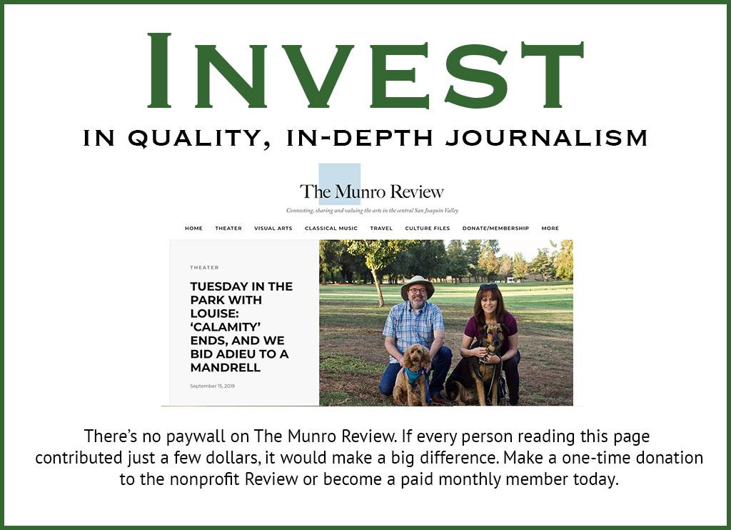 The Munro Review has no paywall but is financially supported by readers who believe in its non-profit mission of bringing professional arts journalism to the central San Joaquin Valley. You can help by signing up for a monthly recurring paid membership or make a one-time donation of as little as $3. All memberships and donations are tax-deductible.