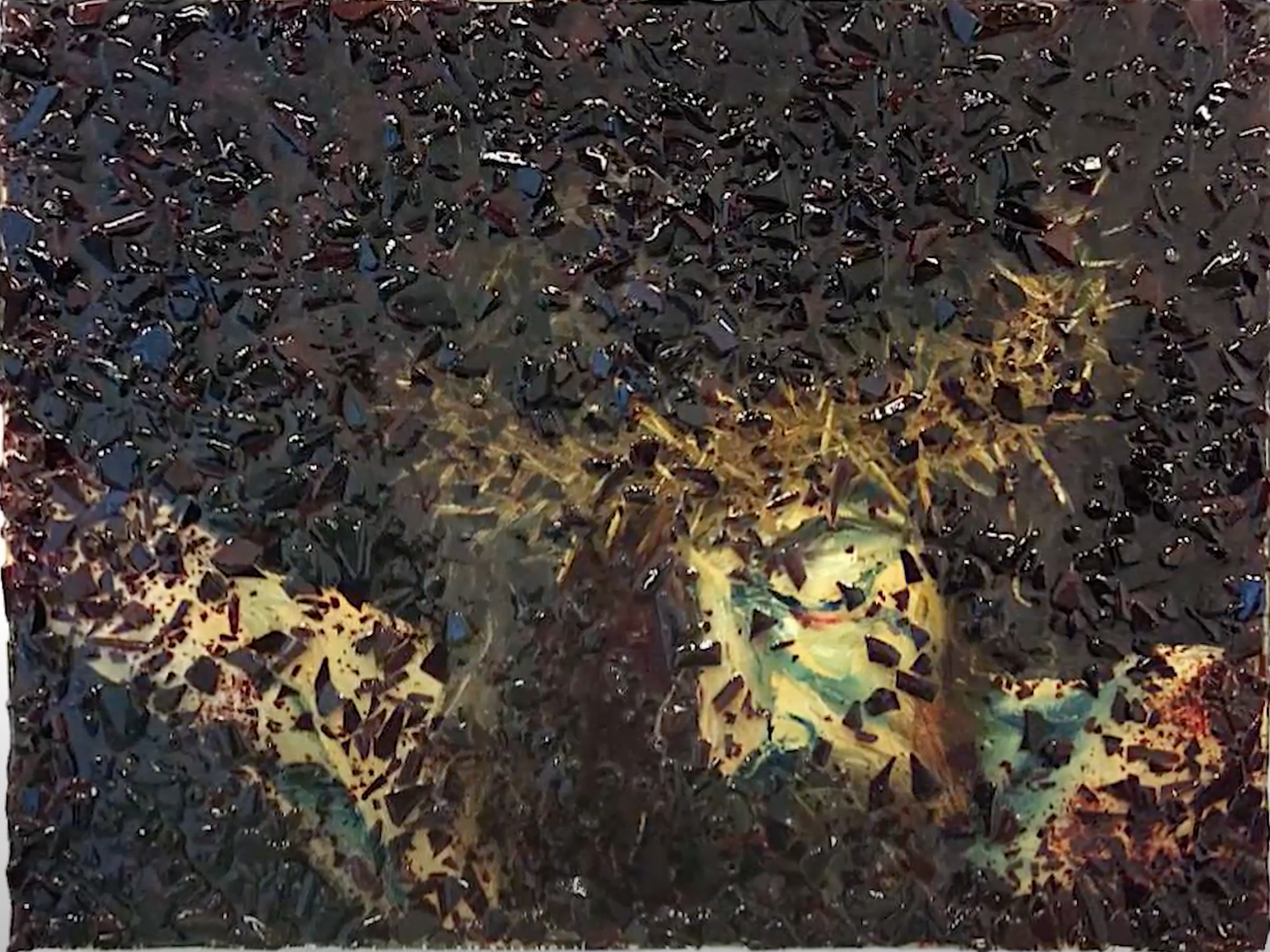 A: “Caritas” was the piece I contributed to our February 2020 show, “Love Is…” For many years, our February shows have embraced themes of love and eroticism. The term “caritas” literally means Christian love for mankind – charity. Christ’s passion is the ultimate act of caritas. Considering my limitations – space and time – the piece has that rhetorical and visual brevity that can either confuse or cut to the quick. Working in my freezing garage, late nights, with a previously used canvas forced me to choose the head and arms of the crucified Christ to fill the visual space. I was actually pleased with the details, especially the crown of thorns, and was hesitant to add the shattered red glass. But, the glass was necessary; it symbolizes the often painful journey to salvation – admitting our sins – and, of course, the blood of the Lamb.