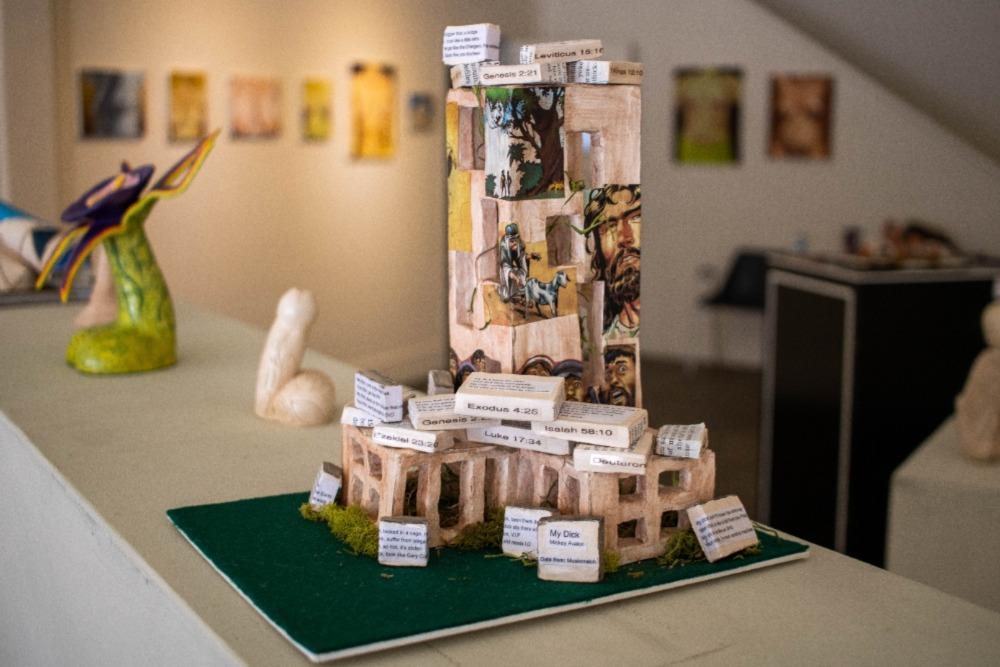 Another sculpture, “Condemned,” caught my attention because it included scriptures and verses from the Bible. While the sculpture was a bit hard to make out as a phallus upon first glance, the scriptures were accompanied by Mickey Avalon’s song, “My Dick.”