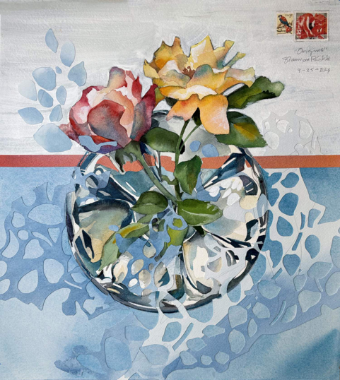 In the second, words inspired a series of watercolor drawings that explore “Light.” She writes: “Of all the mysteries of the cosmos, Light is the most phenomenal. The velocity of light, traveling at 186,000 miles per second, dominates Einstein’s Theory of Relativity, in this theory he proves mathematically that everything in the cosmos is in continual flux with one exception. Light is the one constant.”