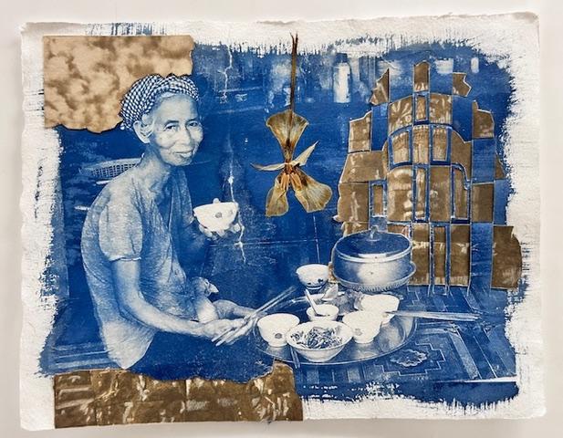 • Wosika says her work teeters between joy and disaster. She writes: “The joy is in making work with natural fibers, handmade papers, and sun-drenched cyanotypes. The disasters are the stories and cries, past and present, we hear from war-stricken countries.” Contrasts mark her engagement. Words are not visible here but rather hidden in the process.