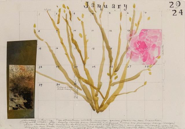 One is a 2024 monthly calendar whose grid becomes an experimental visual record of days. Notes and Quotes are included. The month’s grid is the geometry on which the organic subject stands.