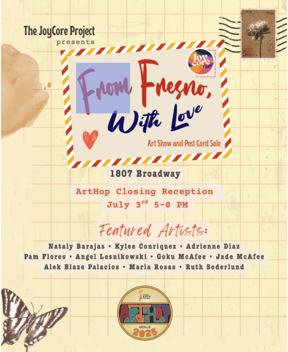 This sounds like a sunny exhibition at the Joy Core Project: “From Fresno, With Love” is an art show and post-card sale. (Remember post cards? They’re wonderful treats to receive in an actual mailbox.) Featured artists are Nataly Barajas, Kylee Conriquez, Adrienne Diaz, Pam Flores, Angel Lesnikowski, Goku McAfee, Jade McAfee, Alek Blaze Palacios, Maria Rosas and Ruth Soderlund.